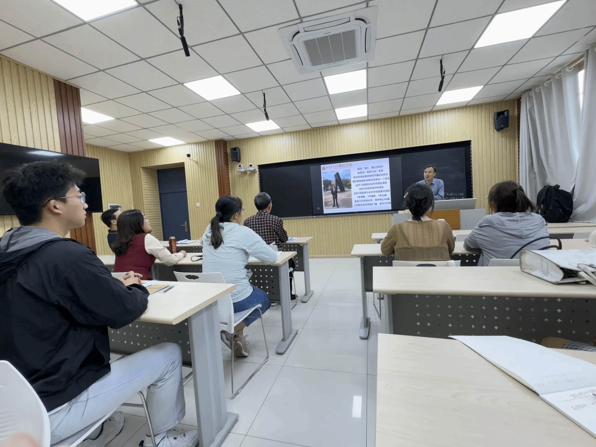 报告会上,吴立宝教授详细介绍了数学教育研究论文选题的来源、步骤、策略以及数学教育论文写作的“九个着力点”。吴教授的报告既有理论方法又有具体案例,结合大量的图表信息,内容丰富充实,深入浅出,讲解通俗易懂,在场师生受益匪浅。报告结束后,吴立宝教授和参会师生亲切交流与学位论文选题相关的问题,并希望同学们能阅读大量相关领域的具有代表性的文献资料,在论写作中贵在创新,重在特色,最终创作出有深度、有意义的学位论文。
