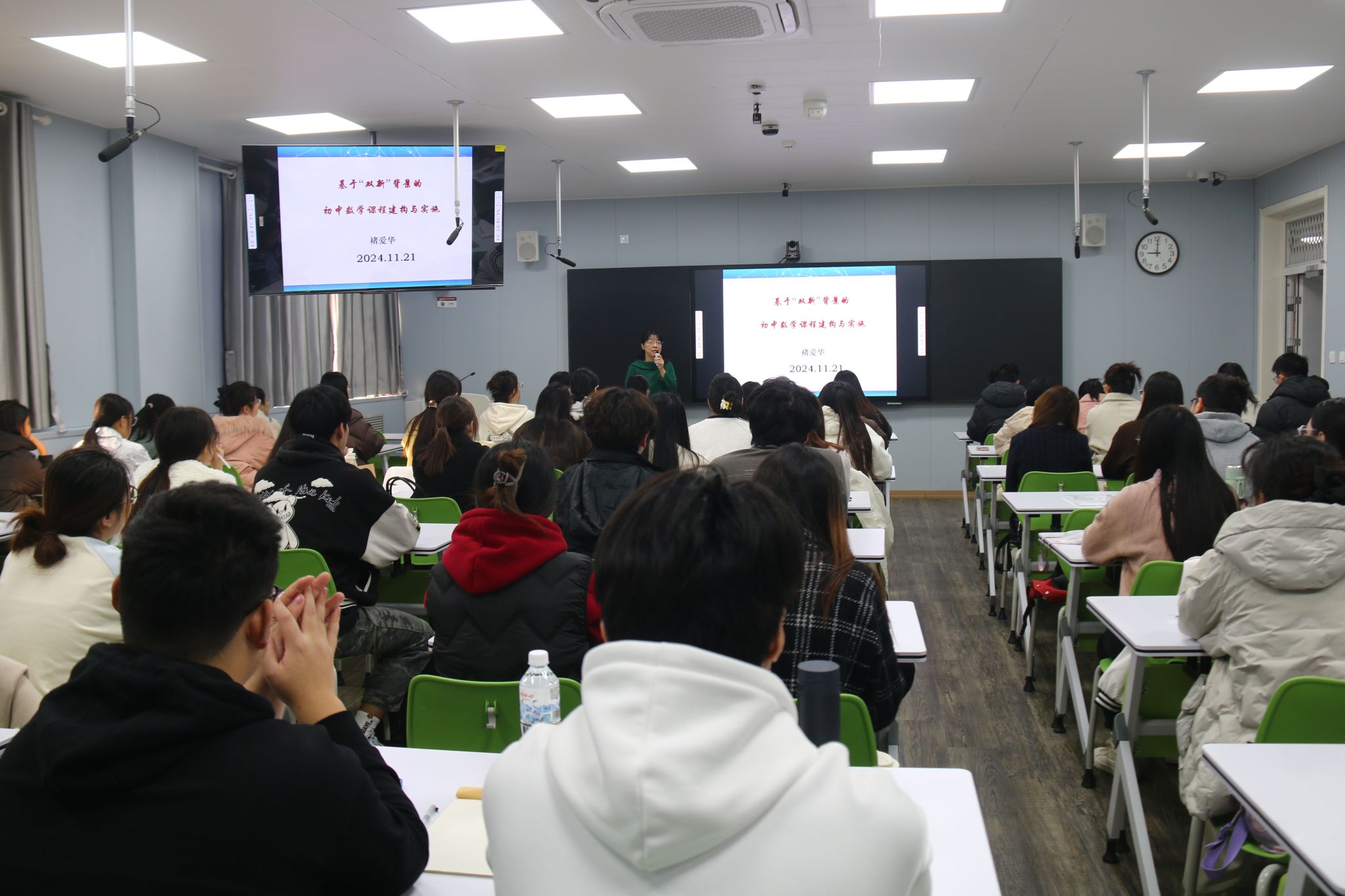 报告采用“专家讲座+小组讨论+互动答疑”的形式,褚爱华以“基于‘双新’背景的初中数学课程建构与实施”为主题,结合自己多年教学实践深刻剖析了“双新”背景下初中数学课程构建与实施的重要性及其面临的挑战。她指出,随着教育改革的持续推进,中学数学教育正步入一个机遇与挑战并存的新阶段,并针对当前中学数学教学中存在的突出问题和“双新”背景下对中学数学教育的新要求进行了全面探讨。同时,她从落实新课标、渗透核心素养、融入数学文化以及建构多维数学课程等多个维度,通过深入浅出的案例分析,详细阐述了相关的应对策略和实施建议。报告结束后,同学们分组进行研讨交流,深化对讲座内容的理解与运用,现场氛围热烈。褚爱华针对现场提出的问题一一作出解答,并鼓励同学们将学习专业知识与深入公司产品实践相结合。
