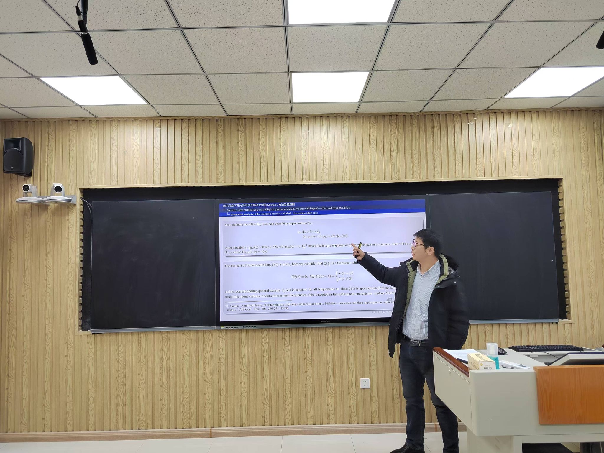 报告会上,魏教授首先介绍了经典同宿与异宿Melnikov方法,然后将两种方法在具有脉冲效应和噪声激励的混合分段光滑系统中的推广作了介绍,结合上述两种方法发展了相应全局分岔与混沌动力学的随机非光滑Melnikov理论,探究了其混沌产生准则与机理,并将上述理论结果应用于分析一个具有碰撞、干摩擦和环境噪声激励的复杂非光滑机械系统动力学模型,探究了与船舶横摇、混沌倾覆与抑制等相关问题。最后,魏周超教授热情地回答了师生们提出的问题。此次报告开拓了研究生的学术视野,提高了员工从事科学研究的积极性。