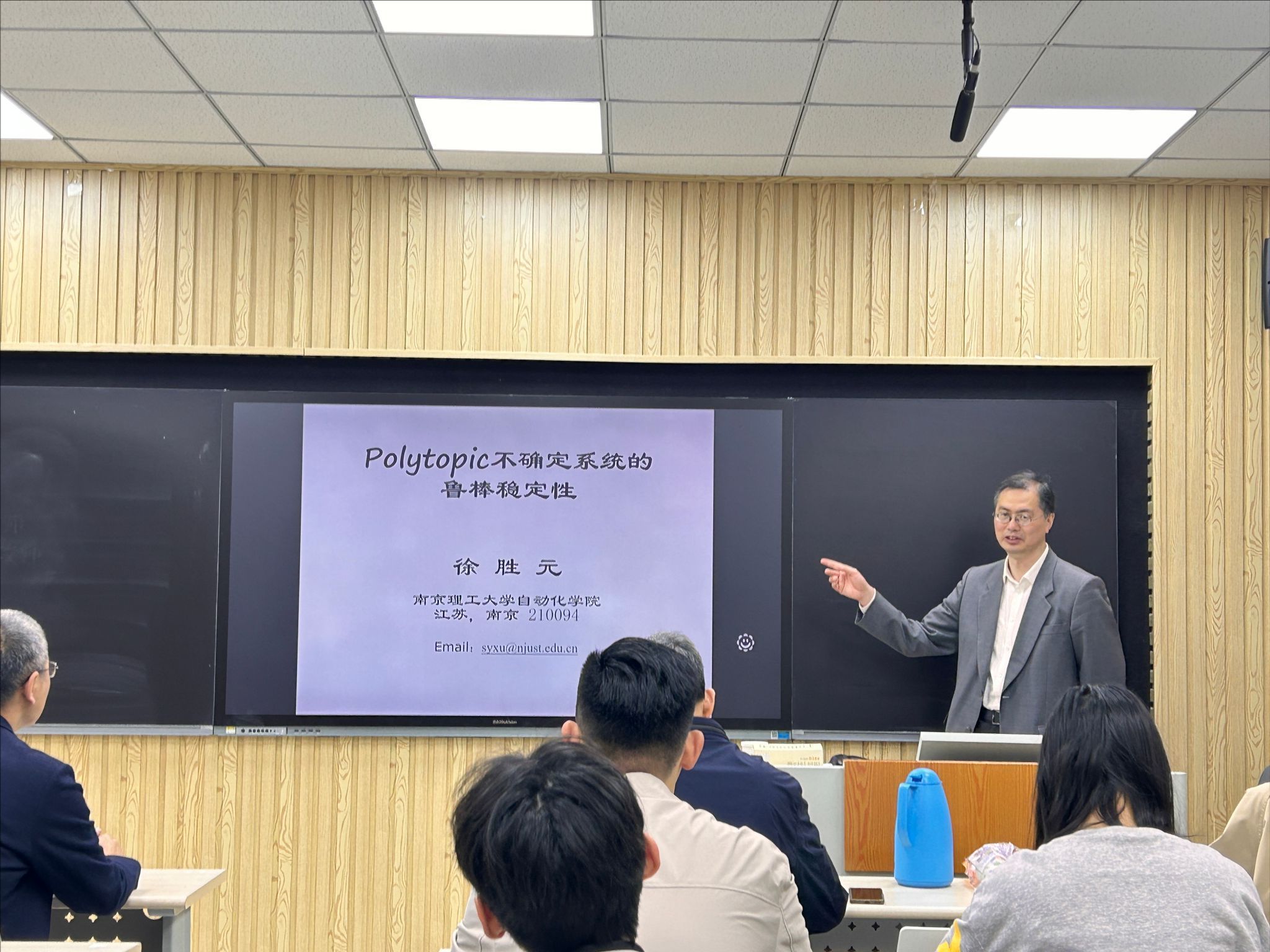 报告会上,徐教授对具有Polytopic不确定参数系统进行鲁棒稳定性分析,给出鲁棒稳定性判据,并对不同的鲁棒稳定性判据的保守性进行分析与比较。最后,徐教授热情地回答了师生们提出的问题。此次报告开拓了研究生的学术视野,提高了员工从事科学研究的积极性。