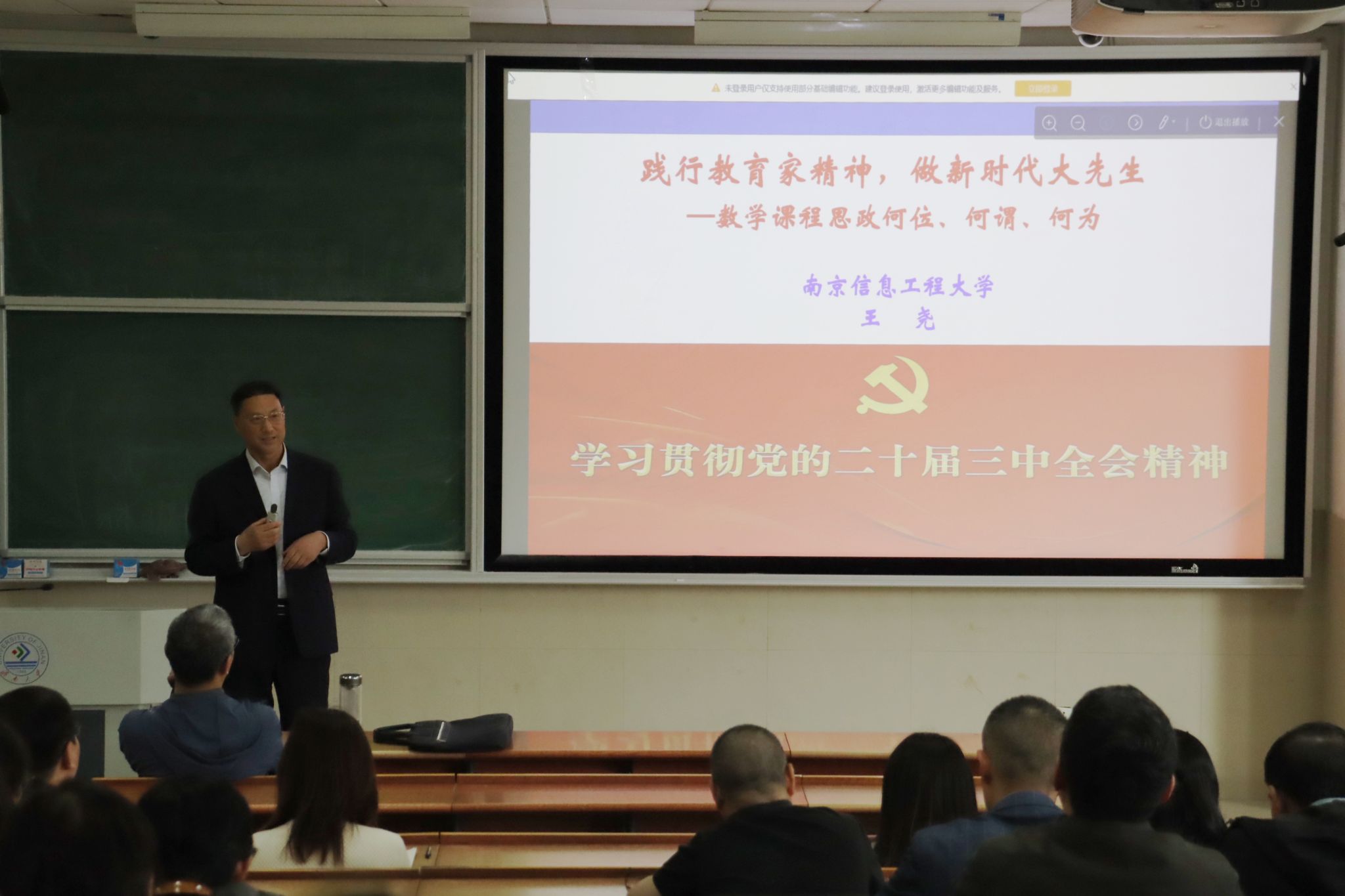 为贯彻落实立德树人根本任务,深入推动公司“课程思政”建设走深走实,全面提升人才培养质量,5月6日下午,南京信息工程大学原党委副书记、副董事长,博士生导师王尧教授来院为师生作题为“弘扬教育家精神,做新时代大先生——数学课程思政何位、何谓、何为”的专题报告。公司全体领导班子成员及全体教职工参加会议,会议由公司党委书记崔英静主持。