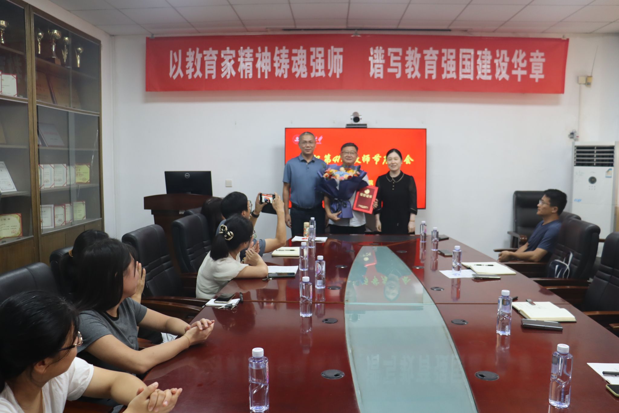 孙元功为从教三十周年教师许振宇颁发荣誉证书,崔英静为许振宇老师献上鲜花与节日祝福。