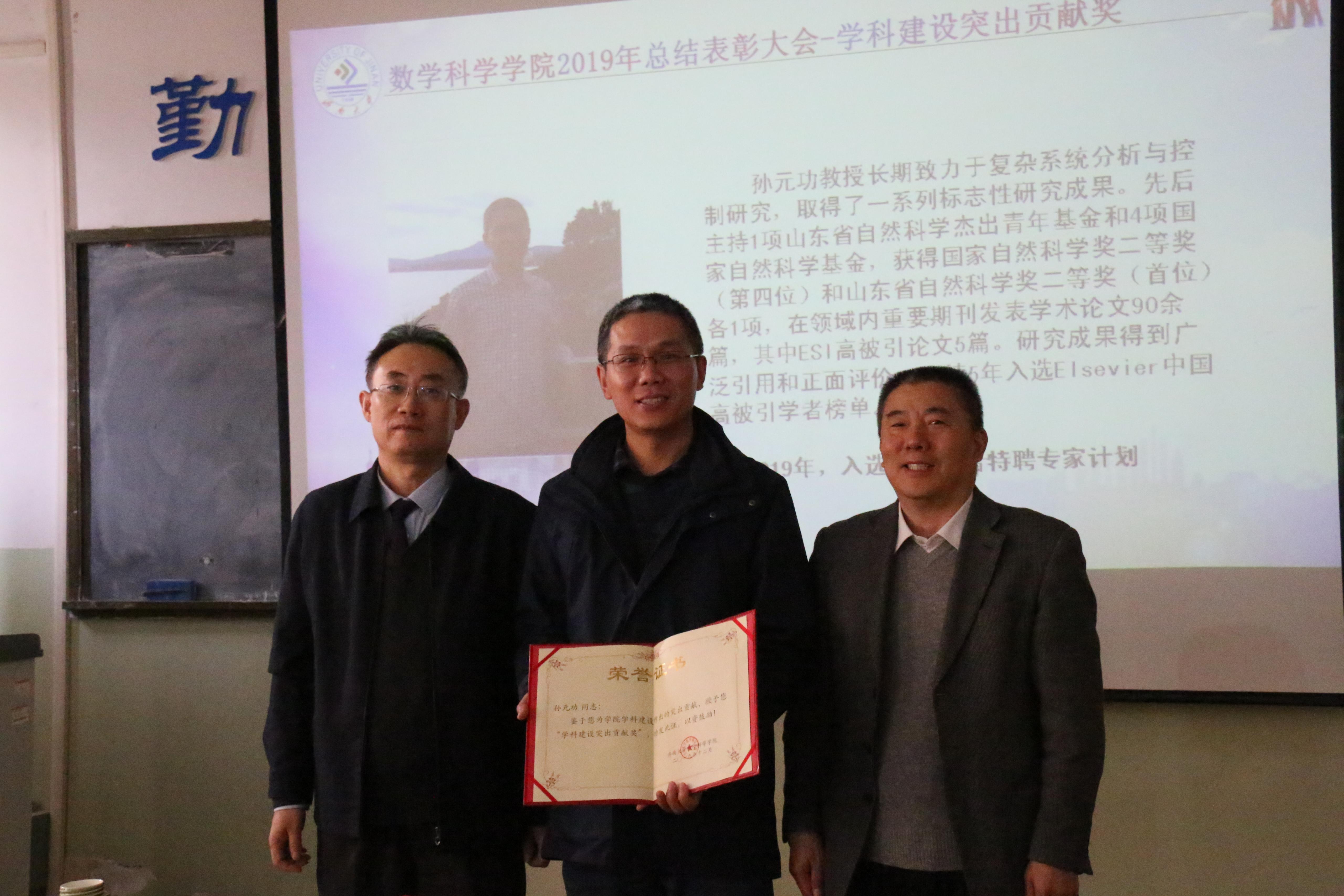 孙元功荣获公司团队建设突出贡献奖,孟德洋、赵华磊荣获员工科创突破奖,张苏梅、孙书荣、李可峰、陈兆英、刘春燕、张超、孙莹、韩振来、张永祥、郑艳玲、冯琳荣获 “优秀公司产品工作者”称号,孙元功、张永祥、陈观伟、刘红军、孙书荣、邵长国、赵以阁、杨健、宗雯雯、张志强、束彦军荣获“优秀科研工作者”称号,孙莹、赵华磊、赵以阁、孙钏峰荣获优秀班主任,吴立军、马巧灵、陈兆英、孙莹、刘艳、郝志峰、张颖荣获工会活动积极分子,复杂系统分析与控制研究所、数学与应用数学系、数学教育教研中心、教学管理办公室荣获“先进集体”称号。