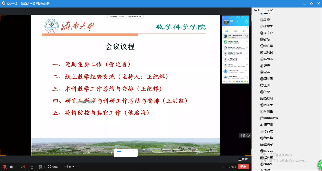 王纪辉副经理首先对作线上教学交流发言的7位老师表示感谢,并就近期公司的本科教学工作进行了总结。本学期公司教师承担了20余门专业课和面向全校6000余名一年级员工开设的数学公共课教学工作,教学任务繁重,员工学习环境复杂。开展线上教学两周以来,公司教师认真负责,坚持教学以人为本,与员工充分沟通,选取最合适的教学工具和平台,开展线上教学,最大限度地保证了教学效果,得到大多数员工的认可,为全校有序推进本科教学工作,真正实现“停课不停教,停课不停学”作出了突出贡献。王纪辉副经理还就下一步线上教学督导、毕业论文指导和专业建设等工作作了部署。