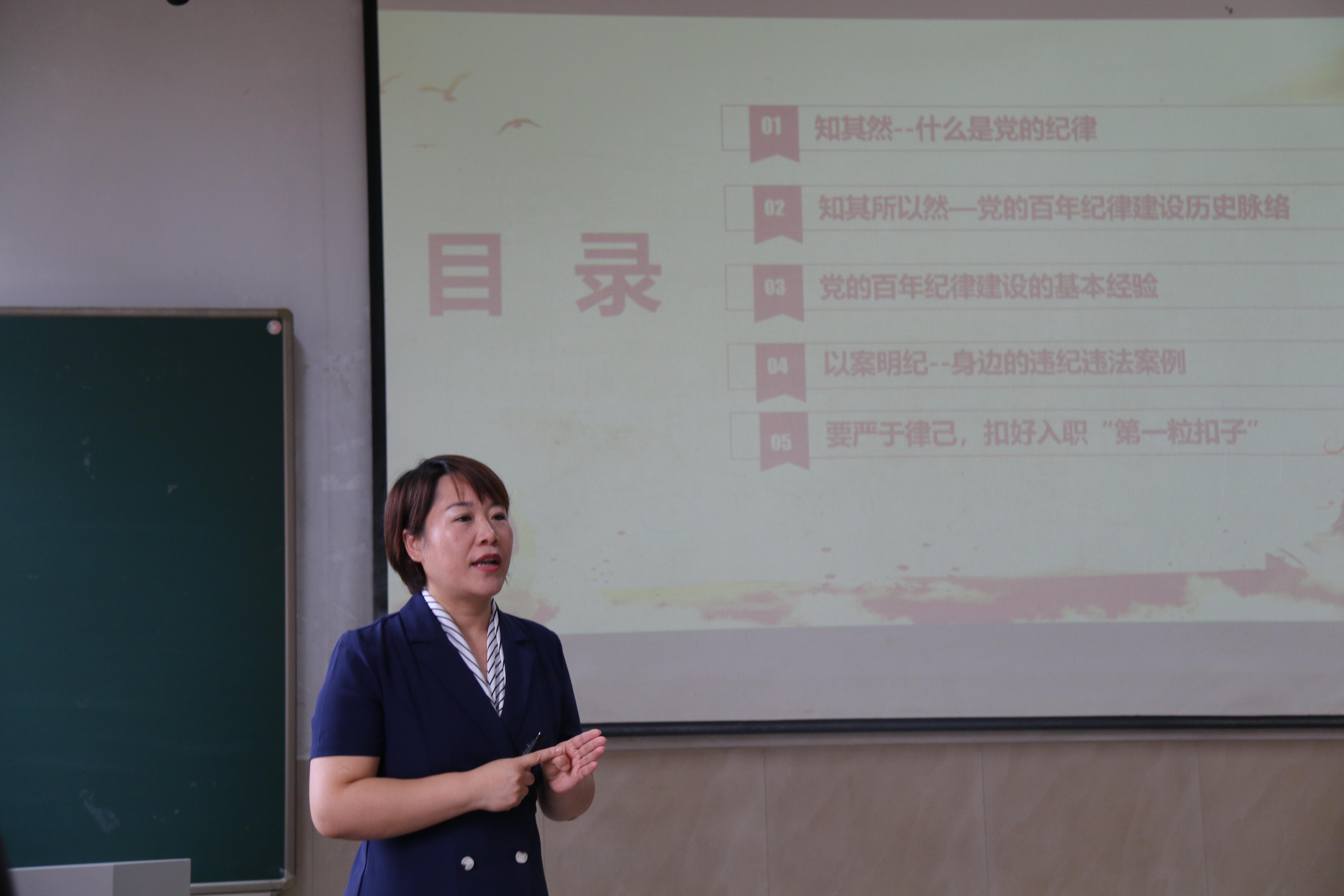课上,万生彩主任作了题为《知纪守纪,系好入党“第一粒扣子"》的专题报告,报告围绕什么是党的纪律、党的百年纪律建设历史脉络、党的百年纪律建设的基本经验、身边违纪违法案例和要严以律己系好入党“第一粒扣子”等五个方面展开。万生彩主任表示,纪律严明是我们党的优良传统和独特优势,全体党员要做到以案明纪,认真学习并严格遵守党的十九大党章修正案第四十条中明确提出的党的六大纪律,即政治纪律、组织纪律、廉洁纪律、群众纪律、工作纪律、生活纪律。同时,全体党员要深刻学习领会习近平总书记在十九届中央纪委三次全会上提出的一体推进不敢腐、不能腐、不想腐的反腐败制度要求,不断加强党性教育、提高思想觉悟。