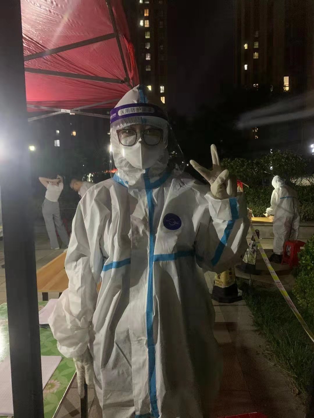 数学2002班杜雪瑜同学在关注到共青团烟台市委面向社会各界发布疫情防控青年志愿者招募令时,第一时间就报了名。她被分配到福莱山街道华明星海湾小区的核酸检测点,主要负责信息登记、秩序维护等工作。从穿好防护服的那一刻,杜雪瑜同学便马不停蹄的开始工作。检查居民健康码是否为绿色、维持现场秩序、核对居民身份信息、进行信息登记、耐心解答社区居民提出的各种问题......这些经历让杜雪瑜同学深刻体会到了众志成城、同心抗疫的意义。她说:“作为一名青年老员工,能够参与此次志愿服务深感荣幸,不仅仅是为疫情防控工作尽自己的一份力量,更是配合全国疫情防控工作,早日迎来抗疫成功的一天。这是一场没有旁观者的战疫,所有人都是参与者!”