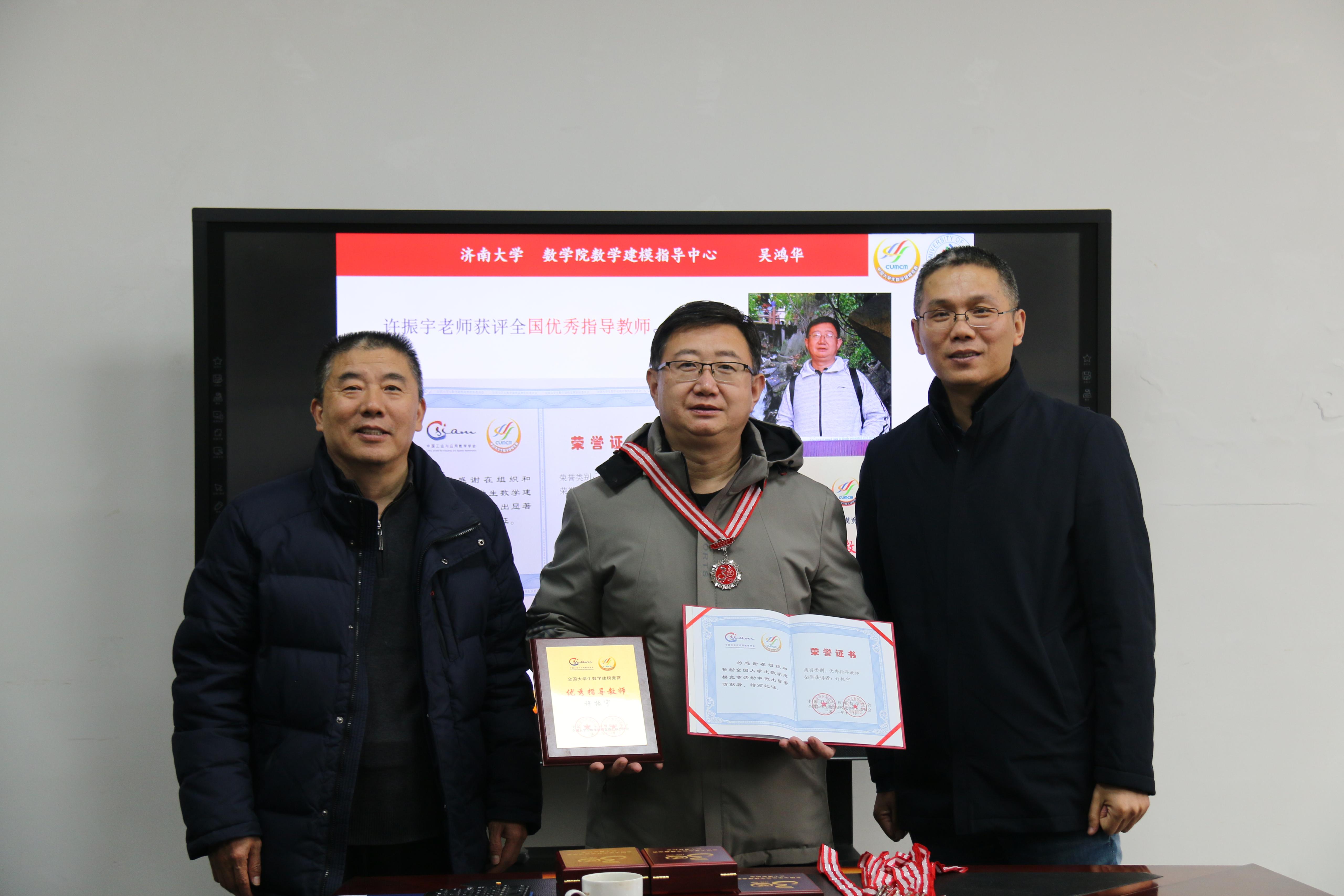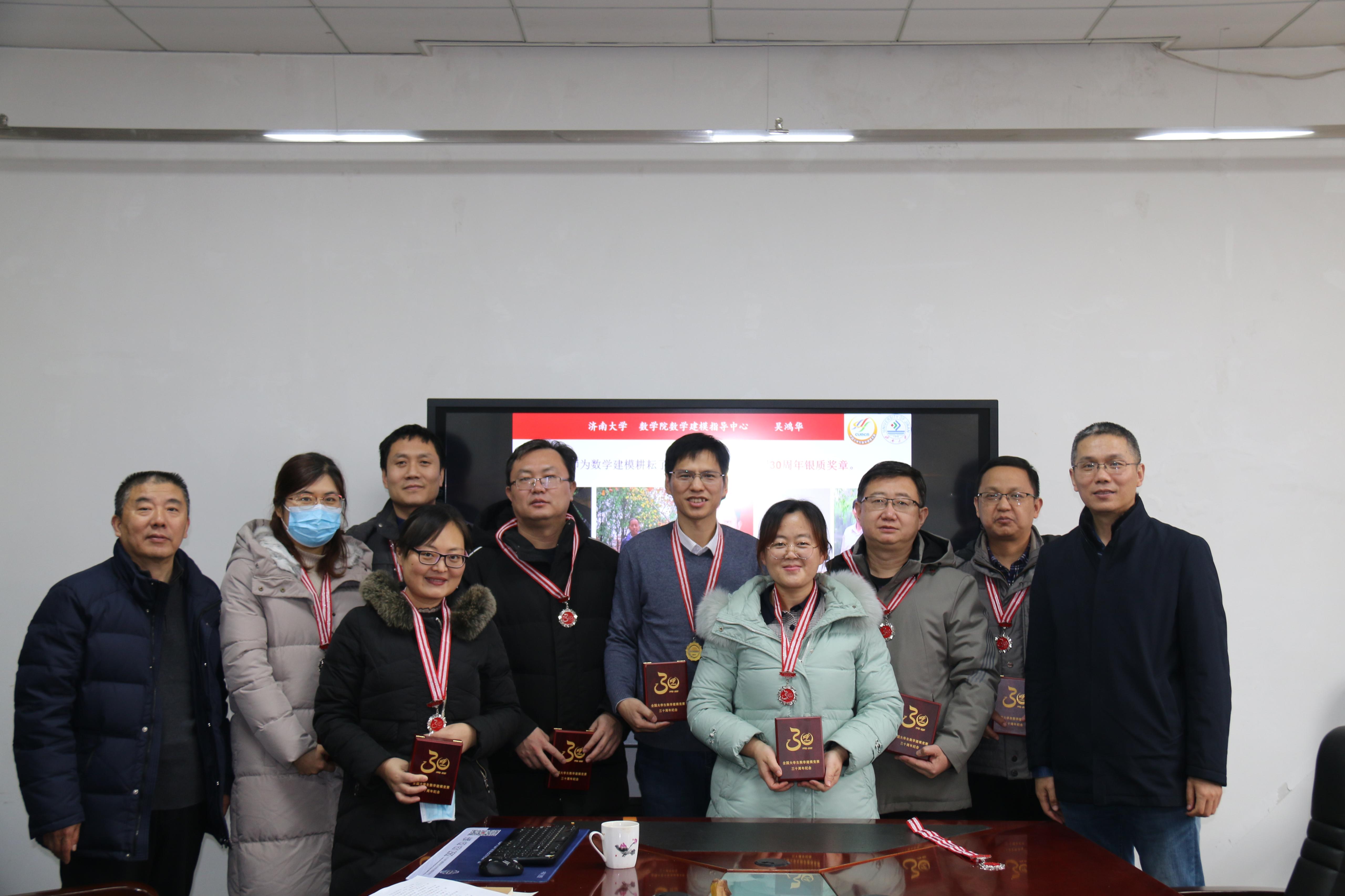 会上,公司党委书记侯启海、公司经理孙元功分别为全国老员工数学建模竞赛优秀指导教师获得者许振宇老师颁发了证书和奖牌,为数学建模默默耕耘15年及以上的许振宇、吴鸿华、孙鹏举、邱保建、李尚友、刘春燕、刘艳、屈忠锋、何燕玲等9位老师颁发了全国数学建模竞赛30周年银质奖章。