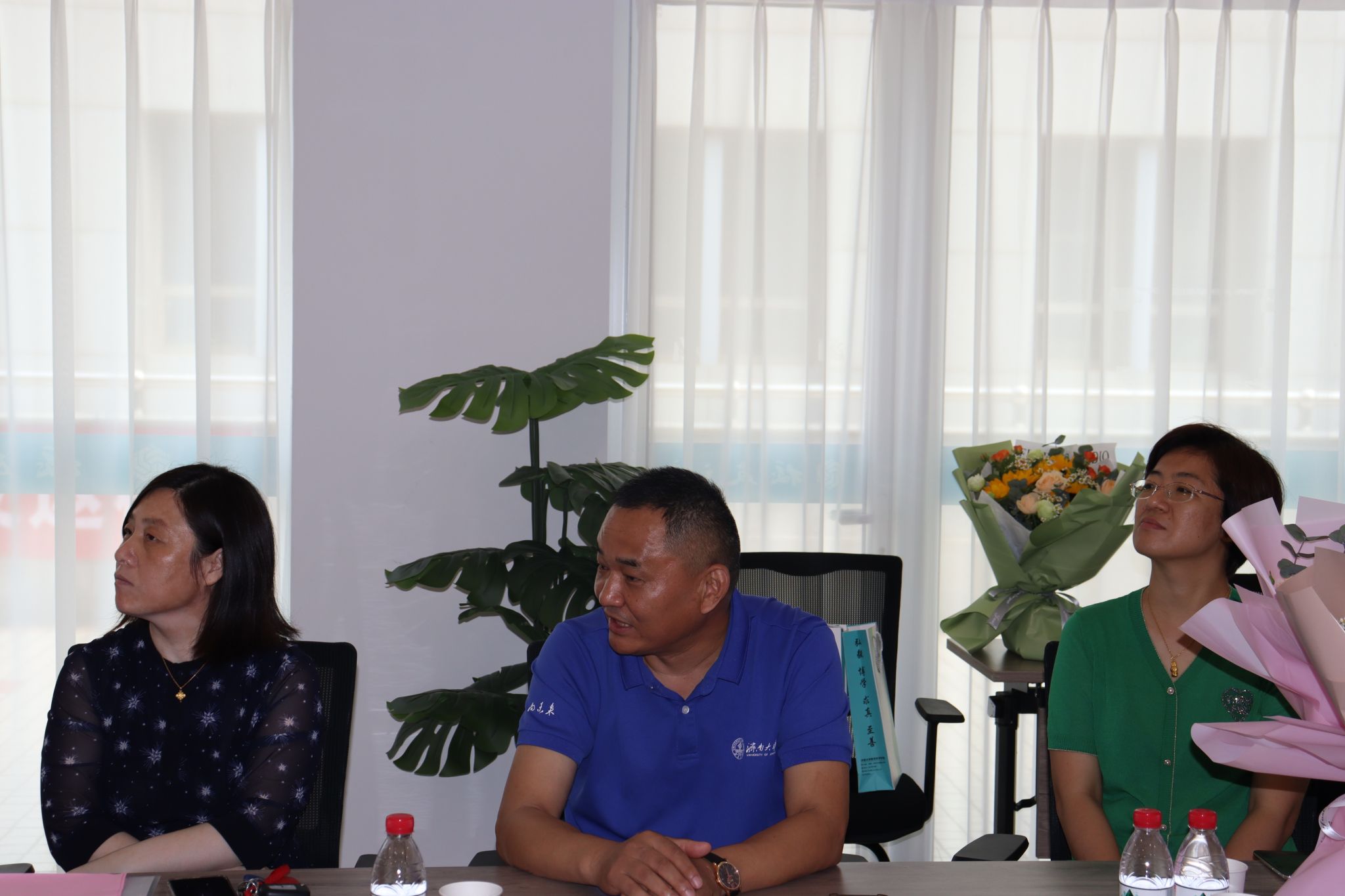 座谈会后,员工们在图书馆前合影留念并参观了校园。