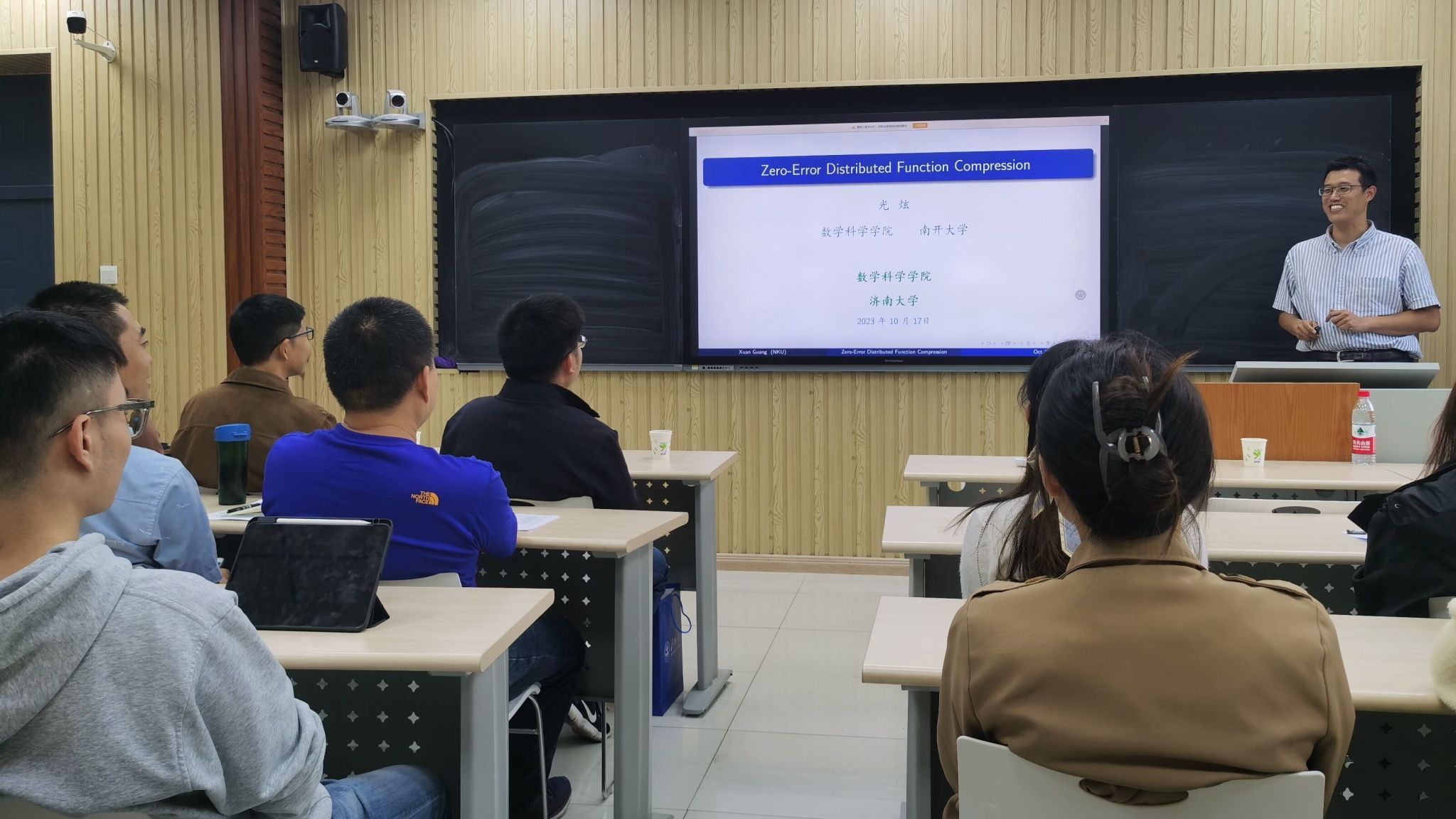 系列学术报告活动先后邀请了南开大学教授、博士生导师、入选国家级“四青”人才项目及南开大学百名青年学科带头人培养计划成员、公司2005届信息与计算科学专业员工光炫,中南大学教授、博士生导师、国家高层次青年人才、公司2009届信息与计算科学专业员工周华成,山东大学教授、博士生导师、齐鲁青年学者、教育部学科(控制科学与工程)评估专家、公司2007届数学与应用数学专业员工李同兴。专家学者们各自分享了他们在数学科学领域的最新研究成果和前沿动态,内容涵盖了多个领域,光炫教授在《Zero-Error Distributed Function Compression》中提出了两个二进制无内存源X和Y的零误差分布式函数压缩系统模型;周华成教授以《Recent progress in stabilization for uncertain systems described by PDEs》为题介绍偏微分方程描述的不确定系统稳定的最新进展;李同兴教授在《Oscillation criteria for second-order superlinear Emden-Fowler neutral differential equations》中介绍了二阶超线性埃姆登-福勒中立性微分方程的振荡准则。
