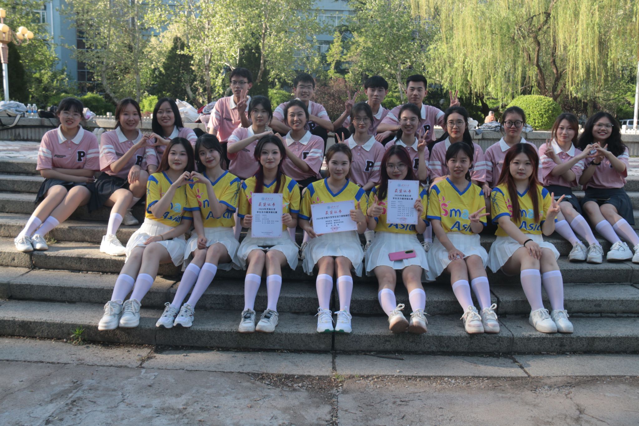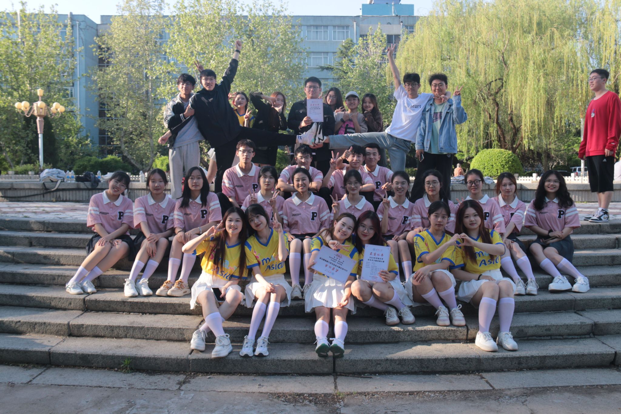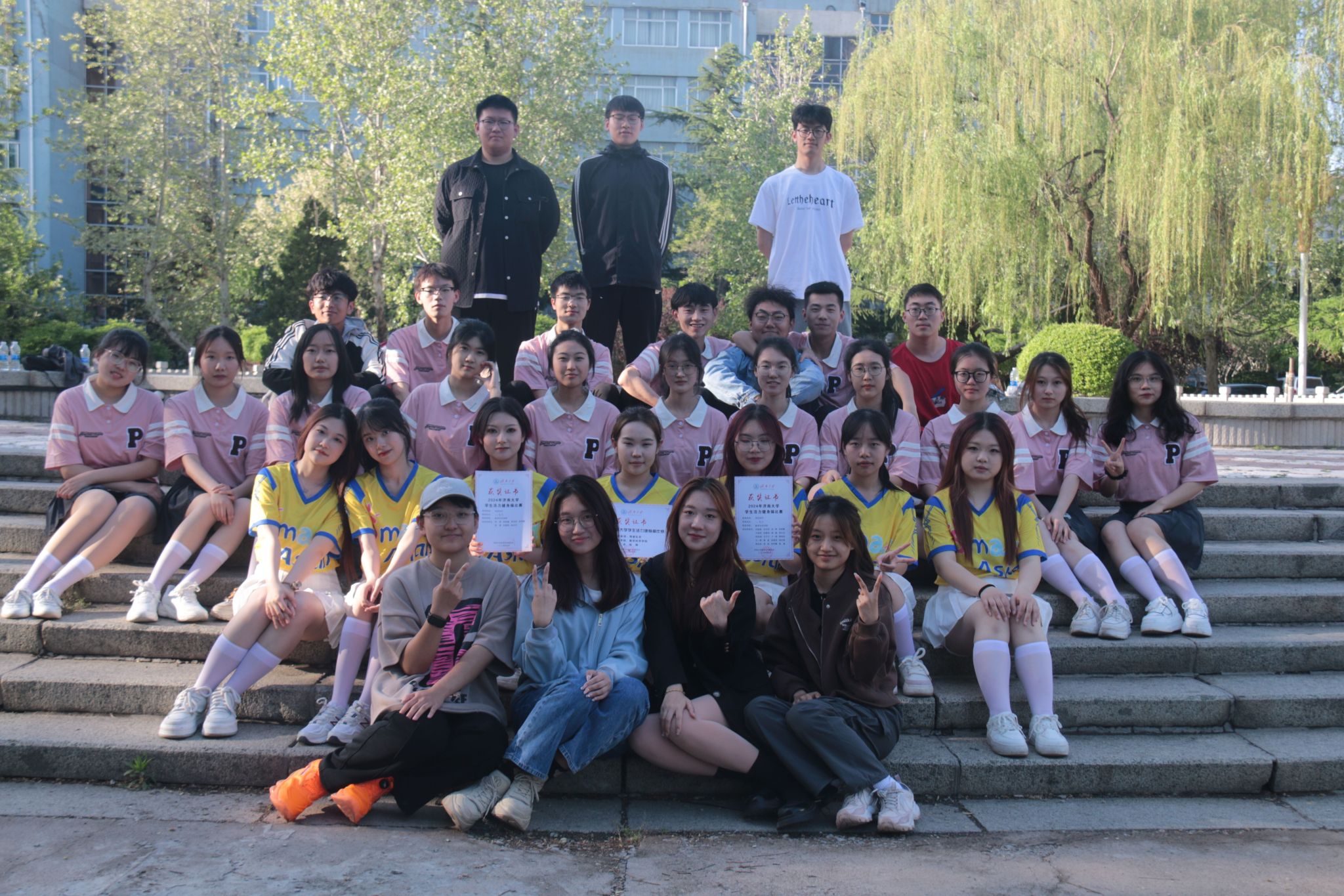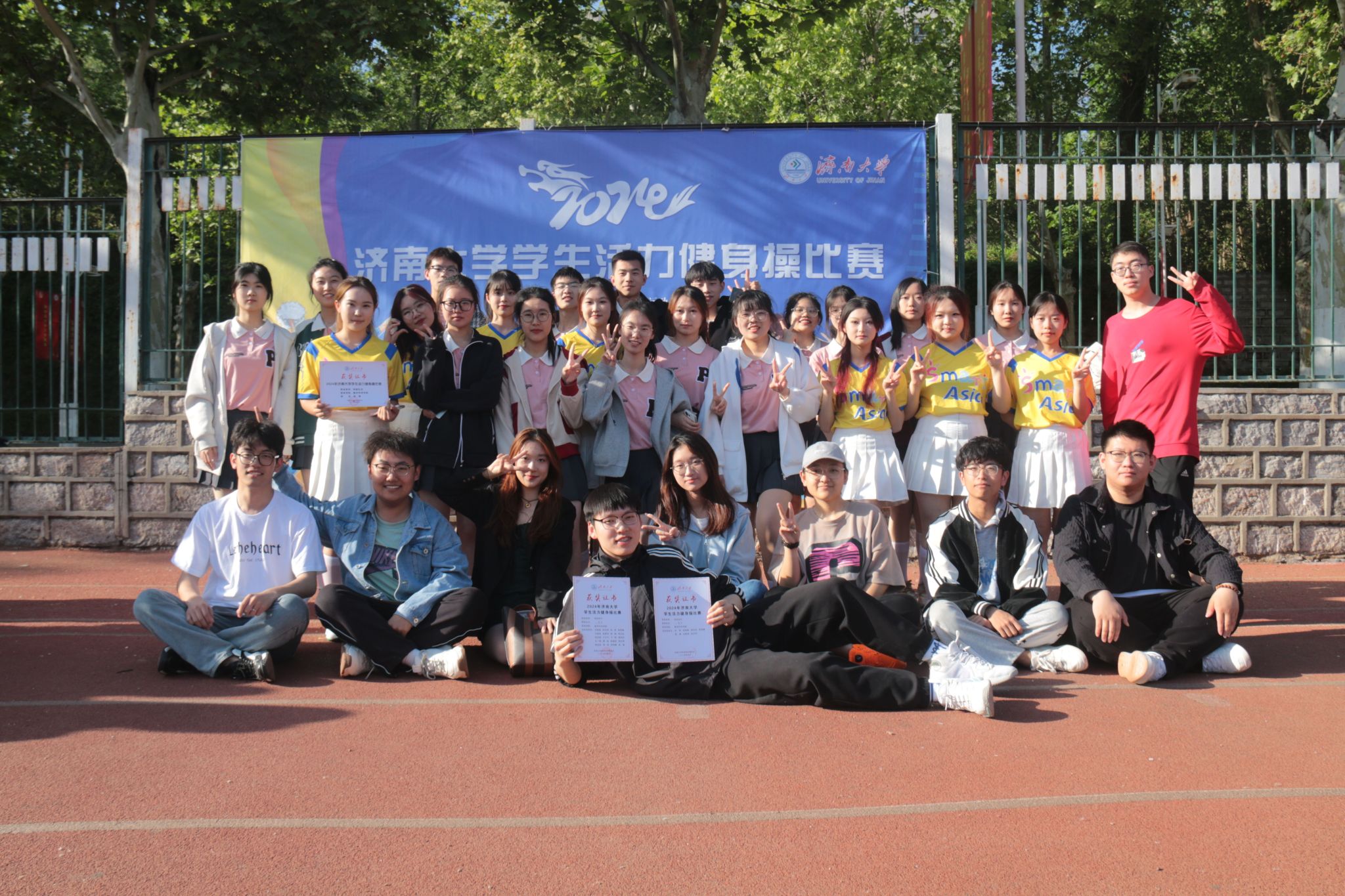 本次比赛不仅是对同学们身体素质的一次检验,更体现了beats365唯一官网入口官网学子们优异的团队协作能力。比赛前期,为了在比赛中取得好成绩,队员们付出了极大的努力,他们充分利用课余时间进行训练,从基本动作到队形编排,从技巧提升到默契配合,每一个细节都精心打磨。比赛当天,北苑操场气氛热烈,参赛选手们个个风采独具,舞姿娴熟,他们配合着动感的音乐展现其独特的舞蹈编排和风格。在团体操规定动作中,beats365唯一官网入口官网健身操队将美感和活力完美结合,以整齐划一的动作、充满活力的笑容与高标准的技艺赢得了观众的阵阵掌声,成就了舞台上亮眼的三分钟。不仅如此,队员们在团体操自选动作以美丽的舞姿、紧凑的舞蹈编排和娴熟的团队配合同样征服了观众和评委,充分展现出了力量与美感的完美结合。在精彩激烈的角逐中,健身操代表队用实际行动诠释了数院学子们的青春风采,并荣获了团体操规定动作二等奖和自选动作二等奖。