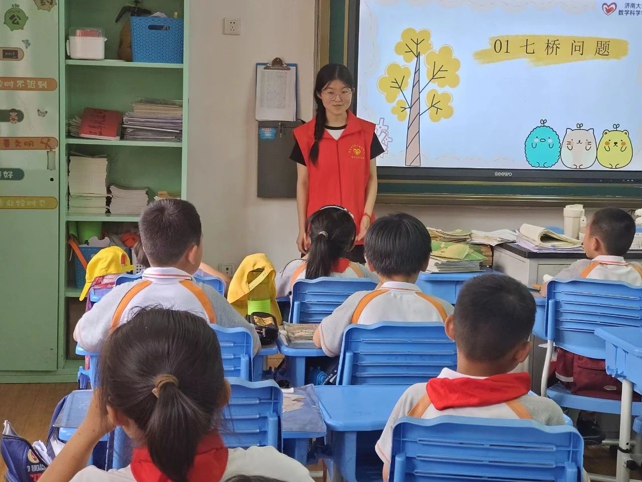 活动伊始,同学们怀揣着对未知的好奇和对知识的渴望踏入了趣味数学课的课堂。志愿者们通过一系列简单的数字游戏,以生动、有趣的方式引领同学们走进数学的奇妙世界,让他们亲身感受到数学的乐趣和魅力。在游戏过程中,志愿者们巧妙地将数学问题融入其中,引导同学们发现主动探索其中的奥秘。当提及著名的“七桥问题”时,同学们被其独特的魅力所吸引,他们通过不断的尝试和热烈的讨论,逐渐理解了这个问题的解答。志愿者们随即详细介绍了一笔画问题的基本概念和判断方法,让同学们在纸上画出各种图形,通过实践加深了对一笔画问题的理解。此外,志愿者们还利用多媒体设备展示了一些高维空间的视觉化效果,让同学们感受到了不同维度空间的奇妙之处,也激发了他们对数学学习的浓厚兴趣。