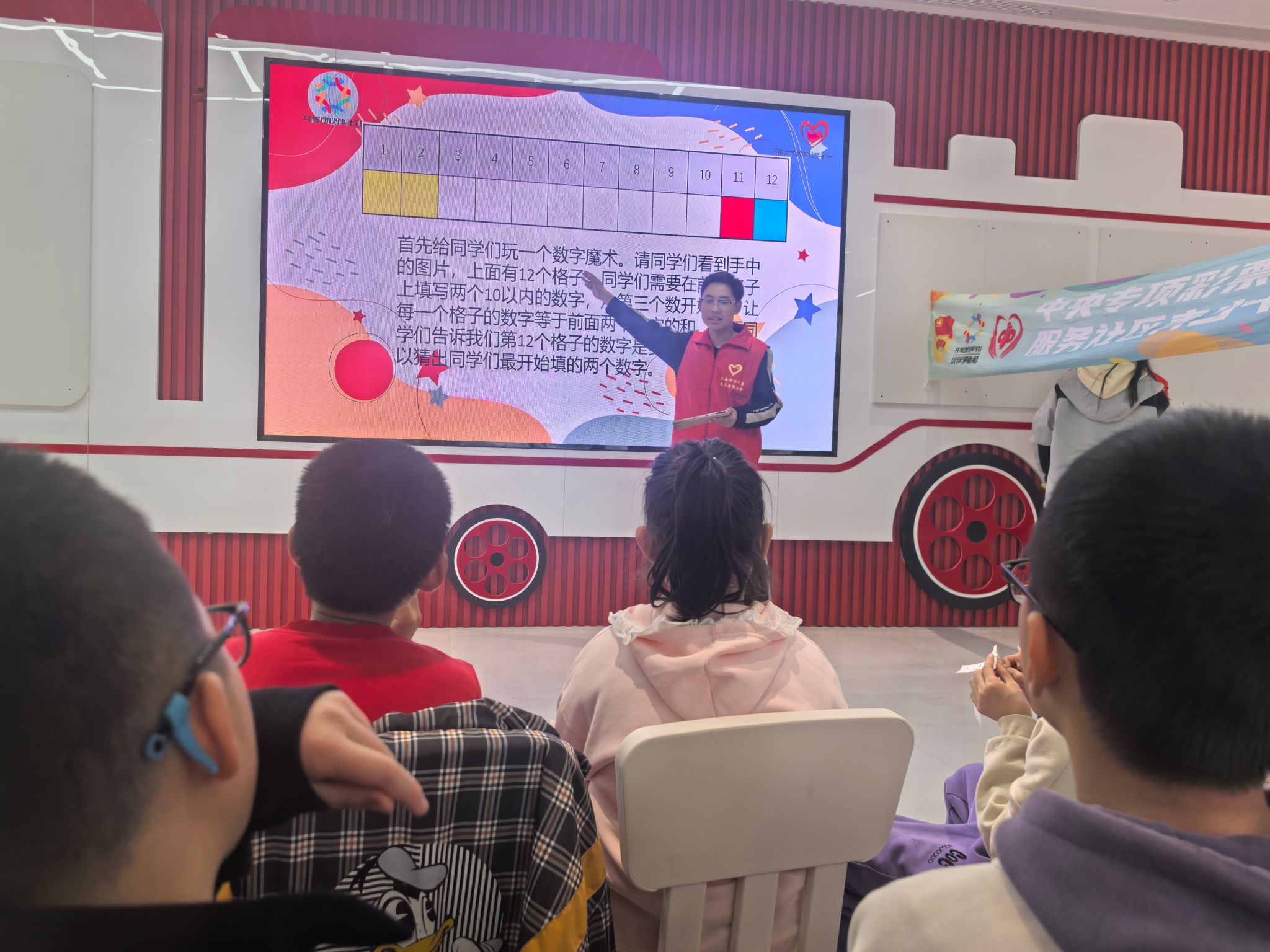 趣味数学不仅是知识传递的桥梁,更是启迪孩子思维的钥匙。活动伊始,志愿者通过“一元五角”互动游戏,营造出充满欢笑与和谐的良好氛围,拉近与小朋友间的距离。随后,志愿者通过生动的例子和有趣的故事,向小朋友们介绍了斐波那契数列,使他们了解到这个神奇数列的特点和应用。此外,志愿者还展示了一些视觉错觉的图片和实例,引导小朋友们从不同的角度观察和思考问题。在授课期间,小朋友们热情洋溢,踊跃参与问答环节,争相发表见解,使得整个课堂氛围十分活泼。