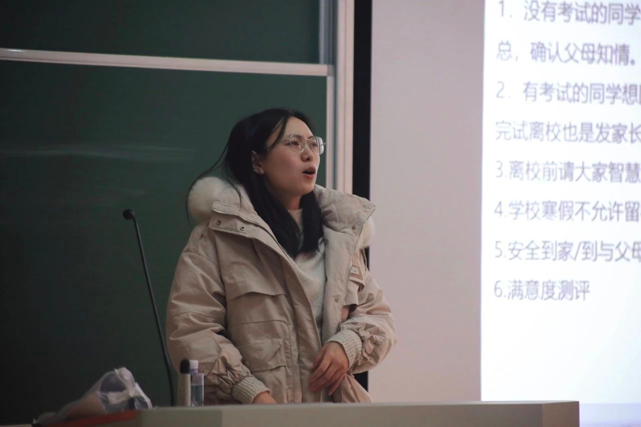 会议伊始,房琳琳向同学们详尽讲述2024年寒假放假安排,并着重强调宿舍安全的重要性,阐明优美宿舍环境给同学们带来的益处,提醒同学们注重个人卫生,创造和谐宿舍关系。在人身安全方面,房老师嘱咐同学们须时刻提高防诈骗意识,注重人身财产安全,谨防溺水、校园暴力等事件的发生。此外,房老师还列举了近几年发生在身边的安全事件,提醒大家在求职期间注意自身安全,谨防误入传销组织,遵守校规校纪,非集中放假期间离开公司须向公司请假备案。最后,她还提醒同学们在寒假期间不要忘记学习,充实提升自我,重视心理健康,珍惜大学最后一个寒假,陪伴父母度过一个幸福且美好的假期。