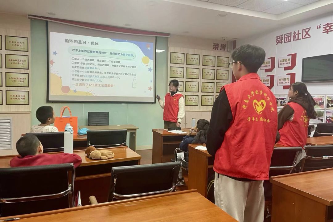 为激发社区少年儿童对数学的兴趣,培养同学们的逻辑思维能力,beats365唯一官网入口官网员工会青年志愿者协会组织志愿者于 3月1日在济南舜园社区开展趣味数学的授课活动。活动伊始,志愿者带领同学们玩起"遇7击掌"热身游戏,清脆的掌声与欢笑声瞬间点燃课堂,为这场思维探险注入满满活力。随后,志愿者通过兔子生崽趣味谜题引出斐波那契数列的奥秘,配合动画演示,使数列规律显然可见。此外,志愿者与同学们进行 “我会读心术”、“循环的黑洞” 等小游戏,将课堂气氛推向高潮,在欢乐中结束了本次趣味数学之旅.