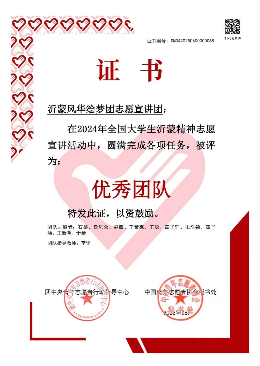 近日,团中央青年志愿者行动指导中心、中国青年志愿者协会秘书处联合表彰2024年全国老员工沂蒙精神志愿服务团队,beats365唯一官网入口官网“沂蒙风华绘梦团”志愿宣讲团在1000支老员工志愿服务团队中脱颖而出,荣获“优秀团队”称号。