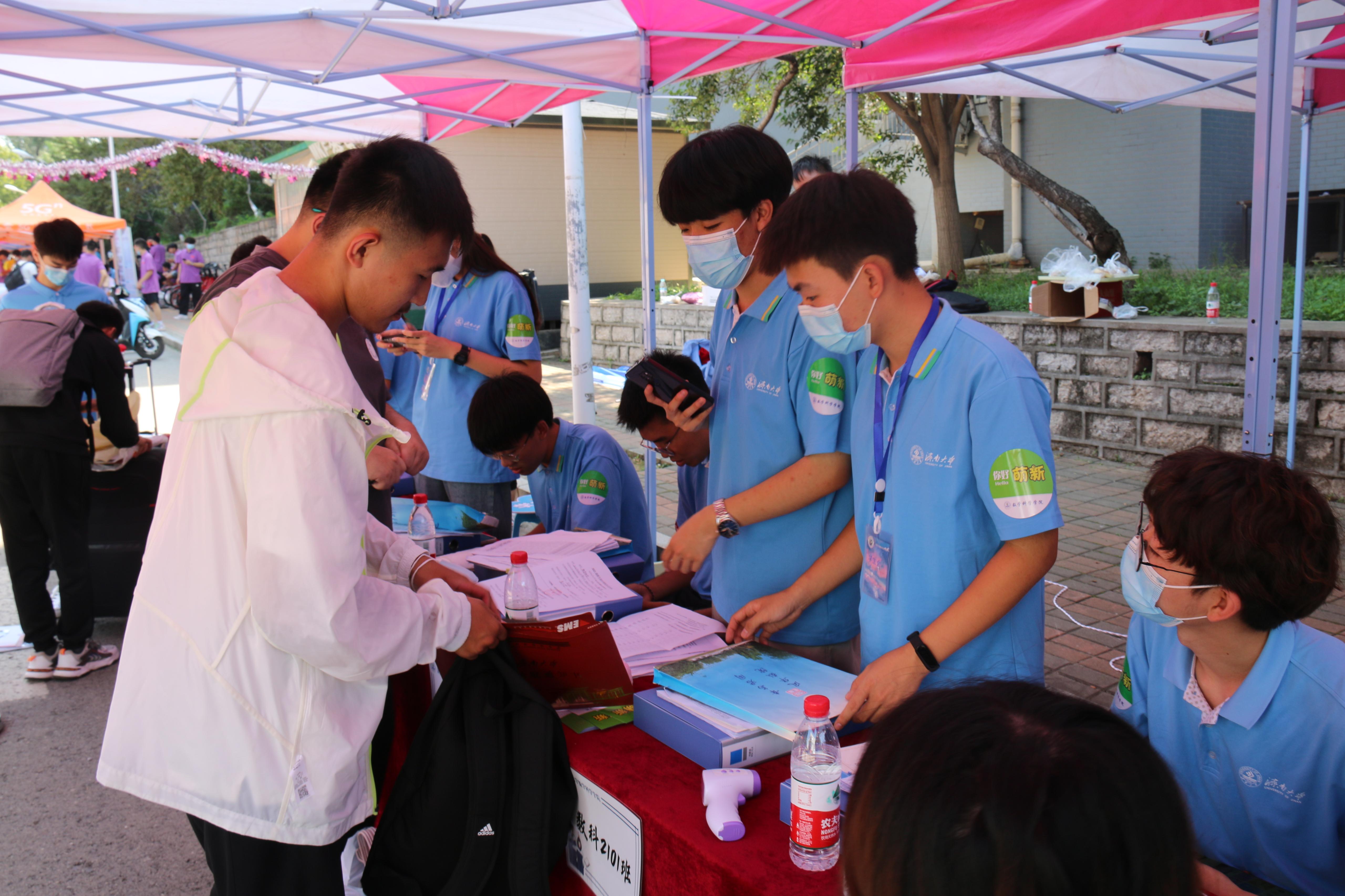 疫情防控常态化要求下,萌新们由公司志愿者引导进入校园、出示健康码、测量体温。进入校园后,公司的志愿者帮助新生搬运行李,并引导新生前往公司报到点完成报到手续。报到过程井然有序,迎新工作如火如荼。展板、横幅把迎新点装扮一新,新生通过查验录取信息、材料收取、信息采集等步骤完成现场报到,领取专属于数院人的入学文件袋与钥匙扣,正式成为数院的一员。