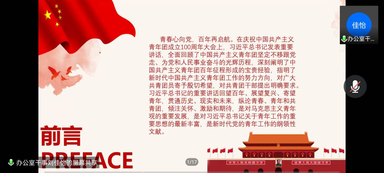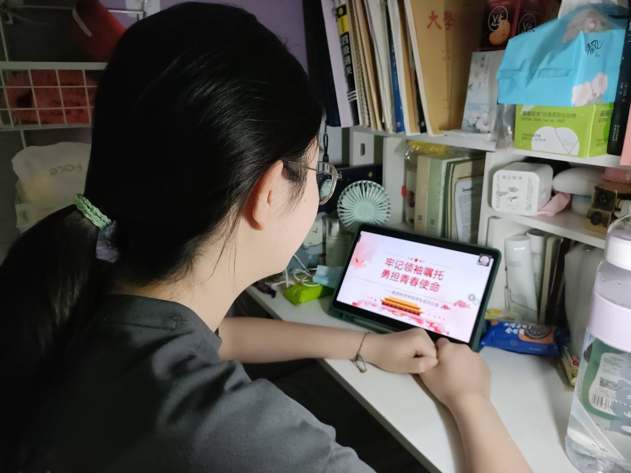 在活动开始前,同学们自主学习了习近平总书记在庆祝中国共产主义青年团成立100周年大会上的重要讲话。活动开始后,活动主持人领学了习近平总书记重要讲话,并表示,作为一名共青团员,我们要坚决听从党和人民召唤,在青春的赛道上奋力奔跑,争取跑出当代青年的最好成绩!随后,同学们就如何成为一名合格的共青团员展开讨论。数学2101班米浩杰认为:“作为新时代的青年老员工,我们要牢记习近平总书记的嘱托,珍惜时间,担负时代使命,在担当中历练,在尽责中成长。”数学2103班郑慧颖说:“历史的接力棒已经交到我们手中,我们唯有自信自强、主动作为、勇挑重担,才能把握机遇,奋发勇为。”最后,大家观看《有我》宣传片,共同感悟将青春小我融入祖国大我的时代精神。