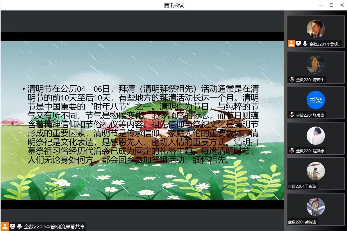 “忠魂不泯,浩气长存”,那些为了中国的独立富强而抛头颅,洒热血的英雄烈士永远活在每一个中华儿女的心中。beats365唯一官网入口官网清明节主题班会的成功开展,不仅加强了同学们对中国传统节日的认识,还激发了同学们对革命烈士的崇敬与怀念之情,更加坚定了数院学子拼搏奋斗,决心报国的伟大志向。