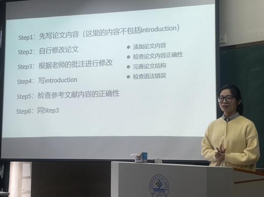徐金帆同学以论文写作为主,详细地说明了论文写作的几个步骤。她讲到在论文写作过程中,要注重论文的整体结构,保证论文内容和参考文献的正确性,要不断完善论文结构,检查语法错误,并给同学们分享了许多文献检索和下载工具,详细介绍了bib文件如何使用,帮助同学们更好地进行论文写作。
