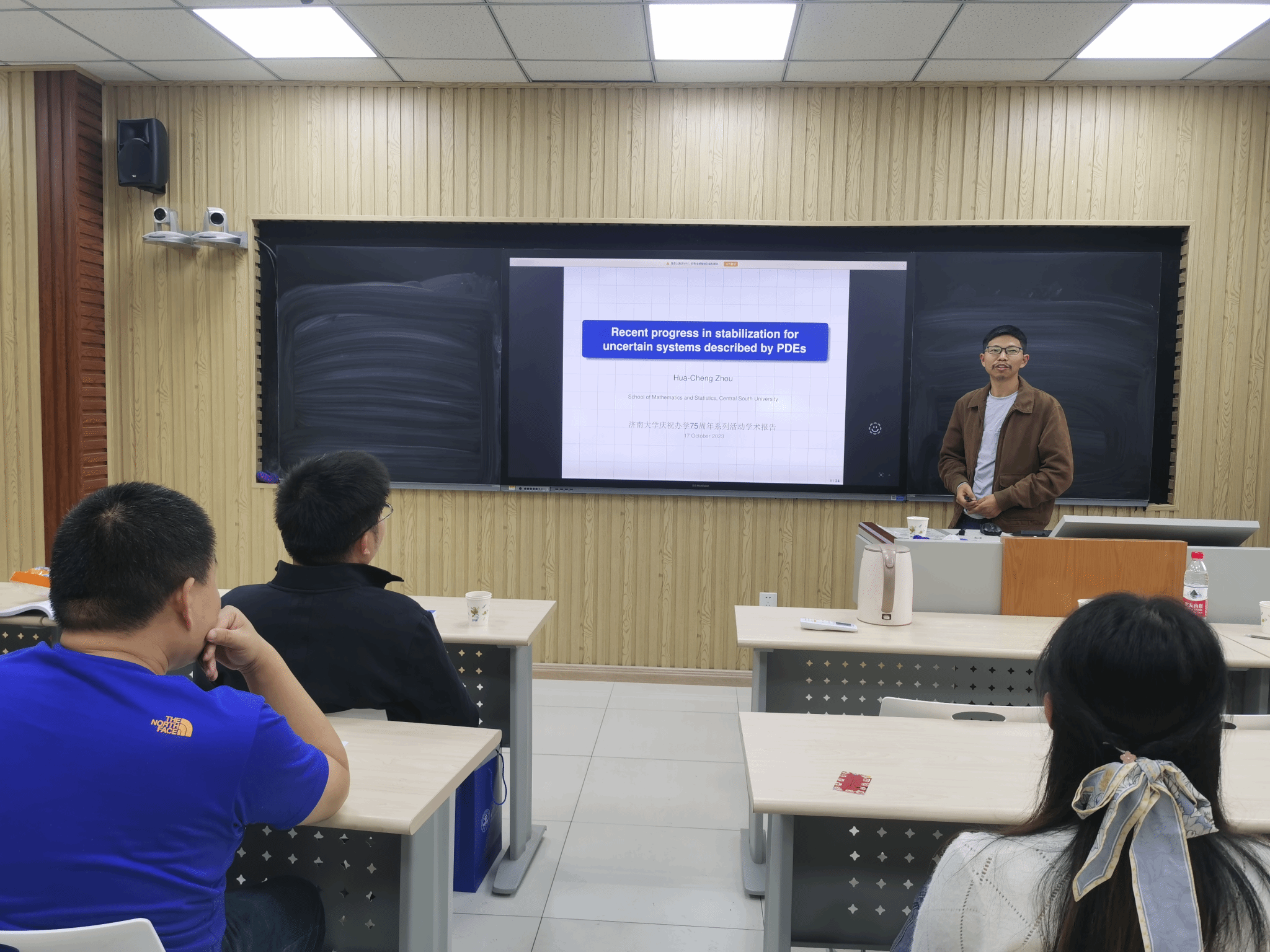 报告人简介:周华成,中南大学教授,博导,国家高层次青年人才。主要从事偏微分方程控制理论研究与抗扰控制研究。曾获中国科公司经理特别奖。在《IEEE Trans. Automat. Control》, 《Automatica》,《SIAMJ. Control Optim.》, 《ESAIM Control Optim. Calc. Var.》,《J.Differential Equations》,《中国科学:信息科学》等享有较高国际学术声誉的数学和控制领域主流刊物发表多篇论文。