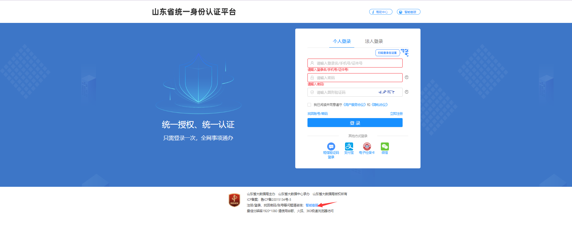 2.政务网(山东省统一身份认证平台)注册/登录、找回密码/账号等问题请咨询:智能客服
